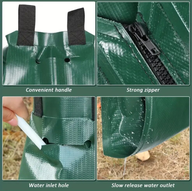 Установить сумку очень просто — достаточно обернуть её вокруг ствола и застегнуть на молнию. При необходимости две и более сумки можно соединить между собой для охвата деревьев с большим диаметром ствола. Для заправки достаточно открыть верхнюю часть и залить воду через специальное отверстие. Конструкция предусматривает медленное высвобождение воды через нижние капельницы, что позволяет использовать сумку даже без постоянного контроля.